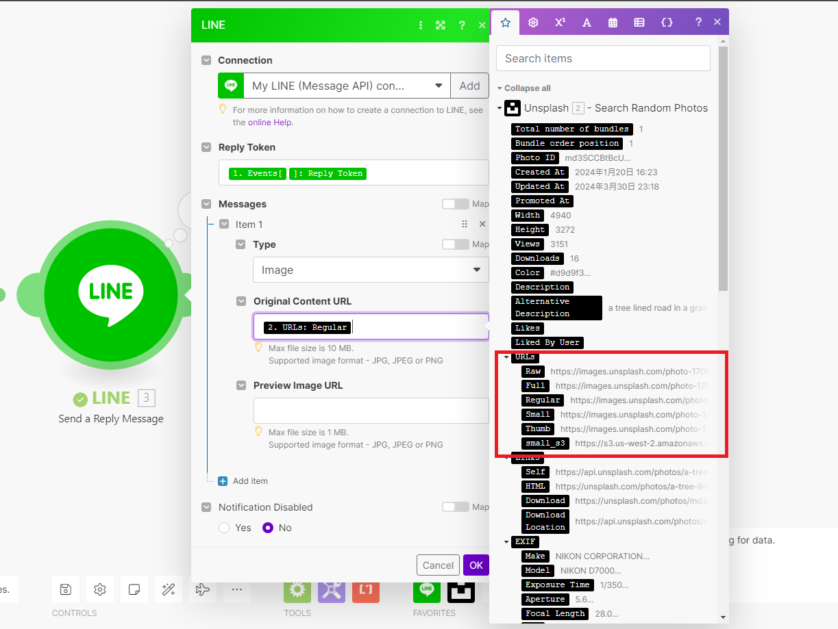 最後的Send a Reply Message則是回傳Unsplash找到的圖片